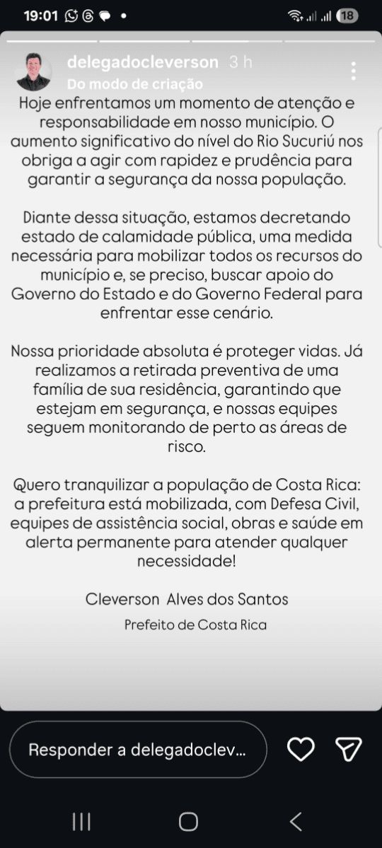 Com esse grande fenômeno natural e preocupante acontecendo no município de Costa Rica, o prefeito delegado Cleverson Alves dos Santos decretou estado de calamidade pública em nota em sua rede social do Instagram.