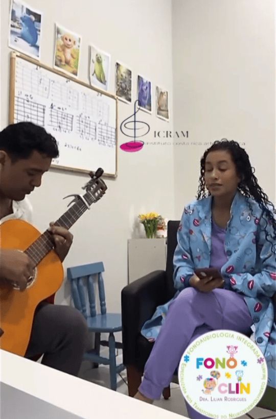 Professor de musicoterapia aplicada e presidente do ICRAM, Samuel Lucas, ensaio cantora gospel e colega de trabalho, Maria Fernanda, na clínica Fonoclin.